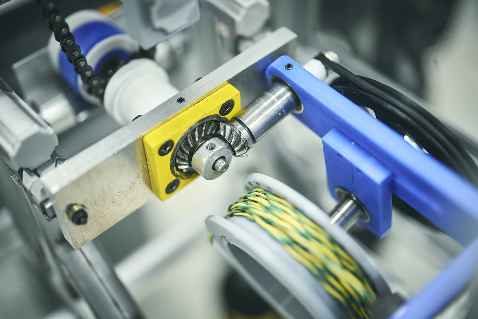 The 3DCG software helped test an arrangement that uses bevel gears to make the bobbin rotate as it revolves. At the same time, a linked pulley turns to spool up the cable. Getting this far took the team about five months.