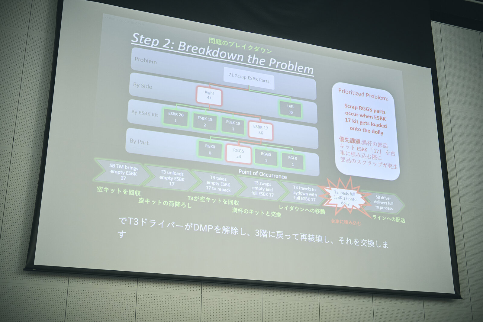 Borrowing ideas from a supplier’s approach, they prototyped gates for securing components. TMMI’s team explained the process of incremental genba improvements that cut the number of dropped parts by 97%.