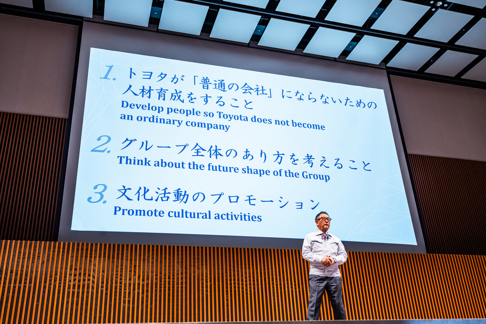 The successor, passing on the baton to the next generation. After offering encouragement to President Sato and his leadership team, Chairman Toyoda then addressed the Toyota colleagues present in this “ba.”