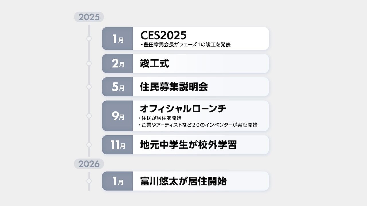 さかのぼること約1年。2025年1月、アメリカで行われた世界的な技術見本市「CES 2025」で豊田章男会長が発表した、ウーブン・シティフェーズ1エリアの竣工。そこからさまざまなイベントがあった。竣工式、住民募集説明会、そしてオフィシャルローンチ…。
