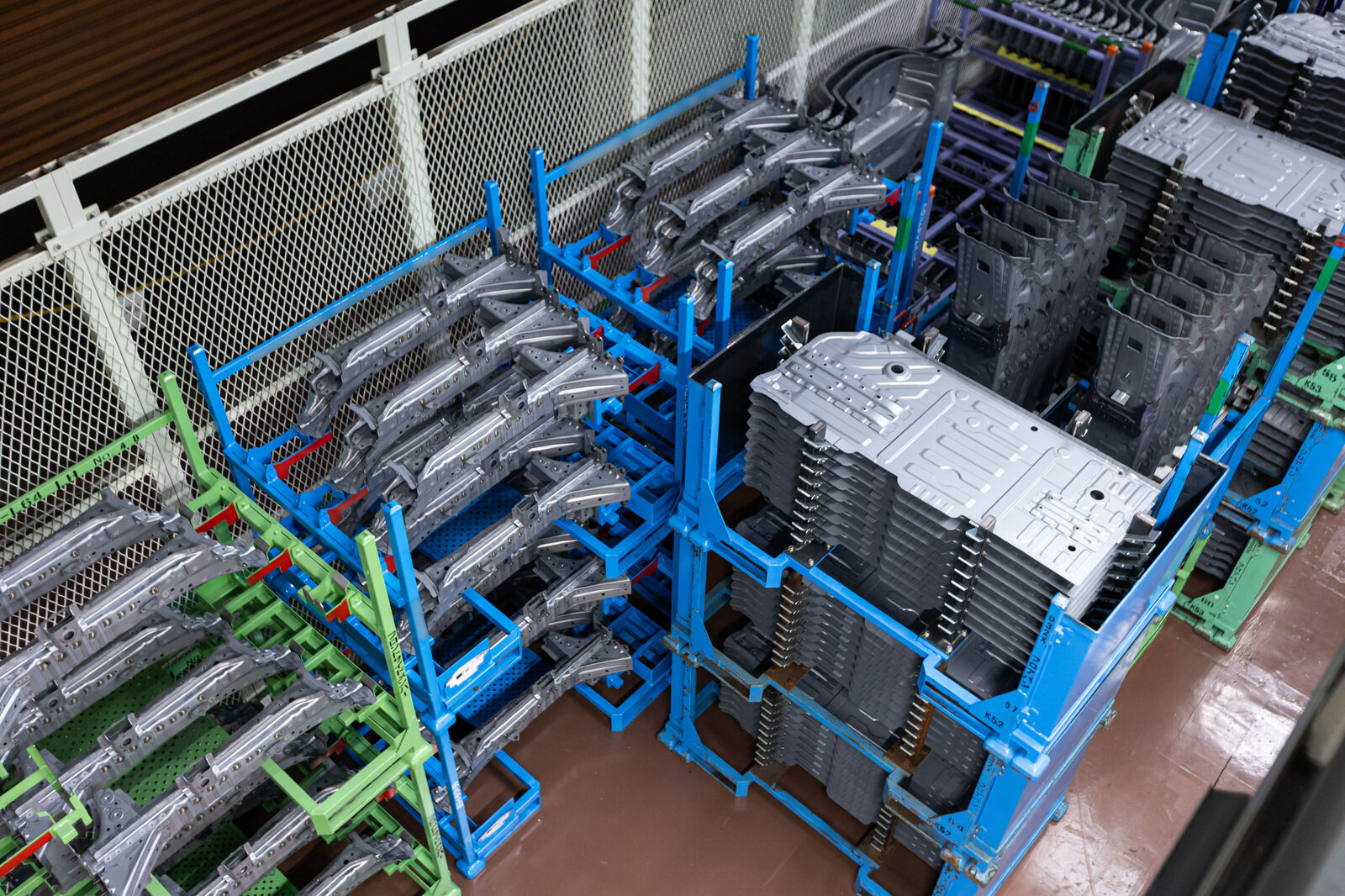 上の写真は、溶接工程で使われるボデーの骨格となるパーツ。これらは、まず物流業者が工場内のヤードに運び込む。