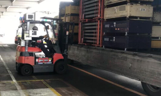 このときトラックでは工場内に入れないため、ドライバーはリフトに乗り換えて搬入しなければならない。