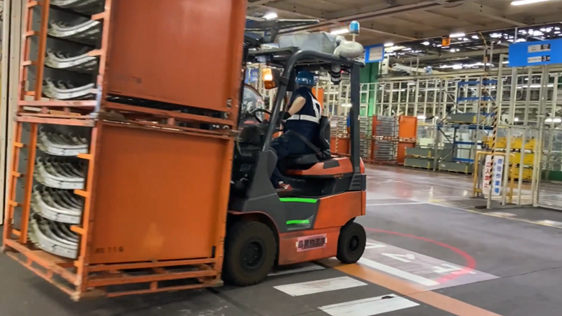 運び込まれたパーツは、構内物流の担当者が牽引車で各工程へ。トラックドライバーも構内物流の担当者も広い工場内を往復する必要があった。