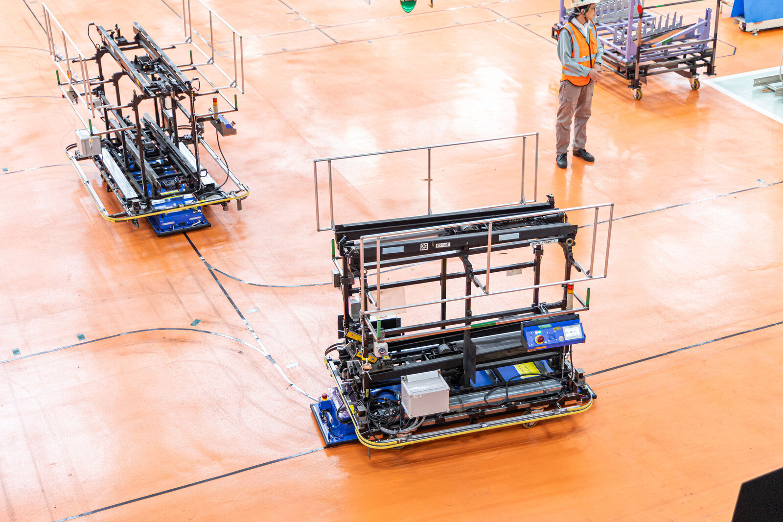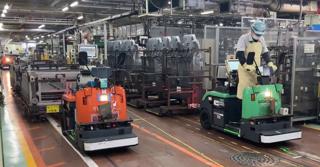 工場内でもAMRが自動でパーツを運搬。人が牽引車を運転する距離は短くなった。