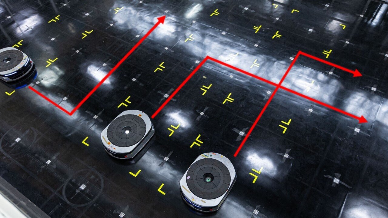AMRは工場の床に貼られた2次元コードを読み取り、直進や後退、左右への方向転換ができる。