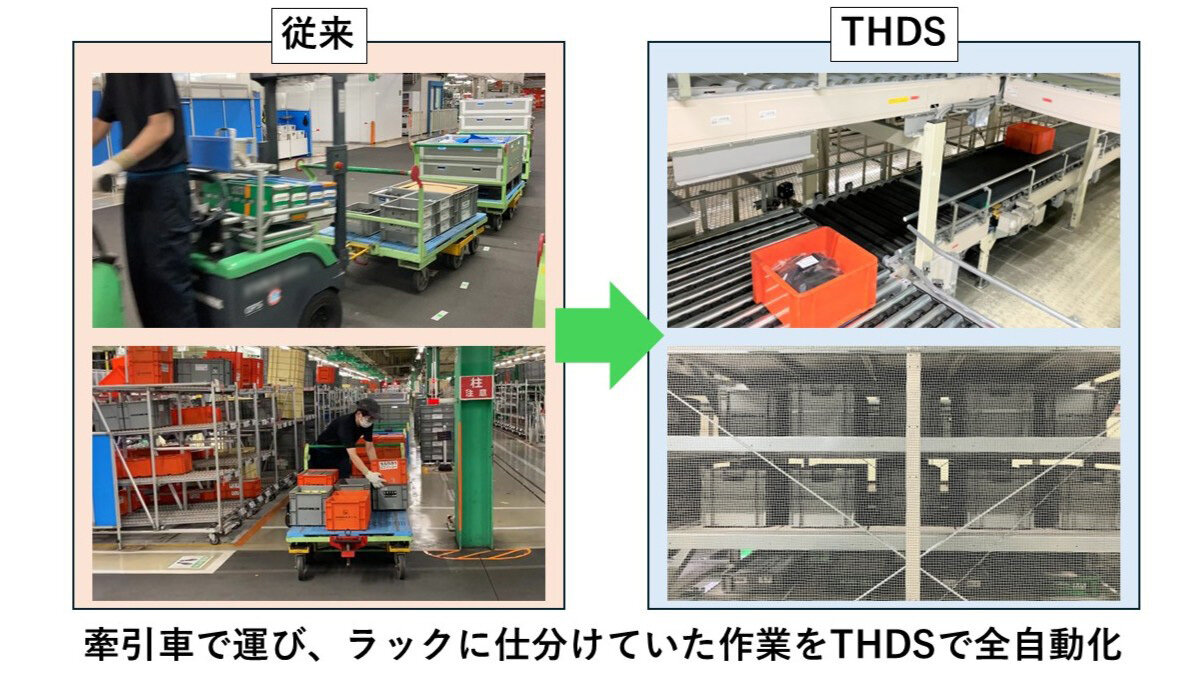 3万点の部品から構成されているともいわれる自動車。THDSはその名の通り、物流業者が運んできた部品を、工程や種類ごとに自動で仕分けてくれるシステムだ。