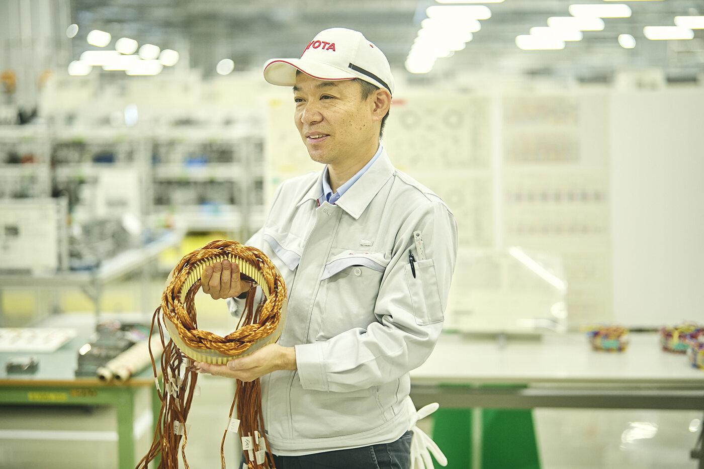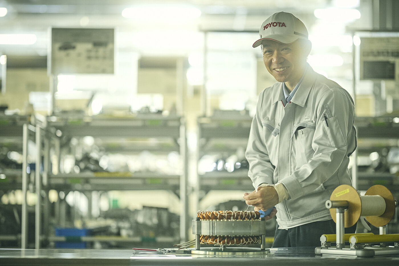 今回は、ハイブリッド車(HEV)や電気自動車(BEV)の動力源となるモーターのコイル開発を30年に渡って支えてきた、パワートレーン製造基盤技術部の永濵佳喜の後編をお届けする。