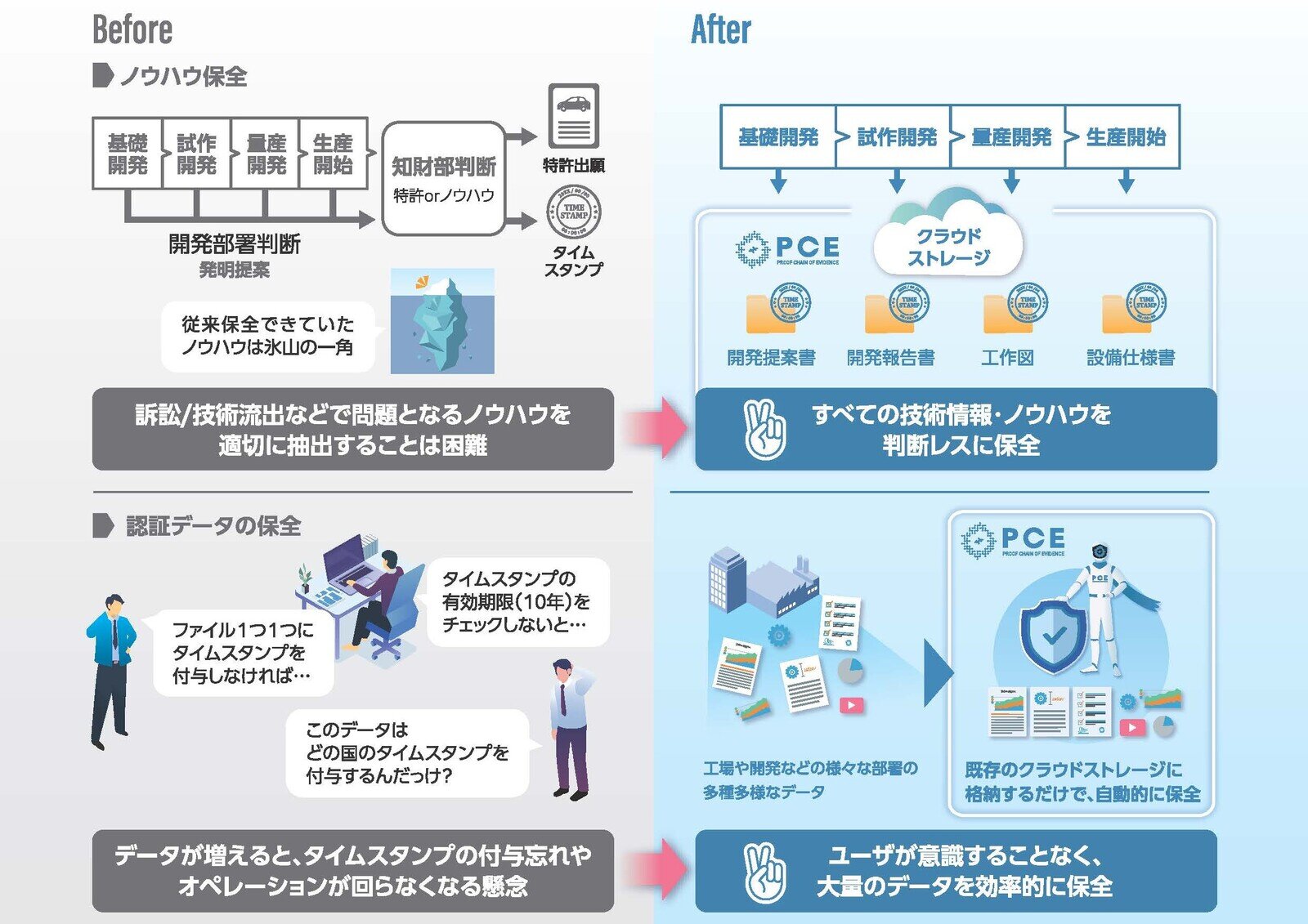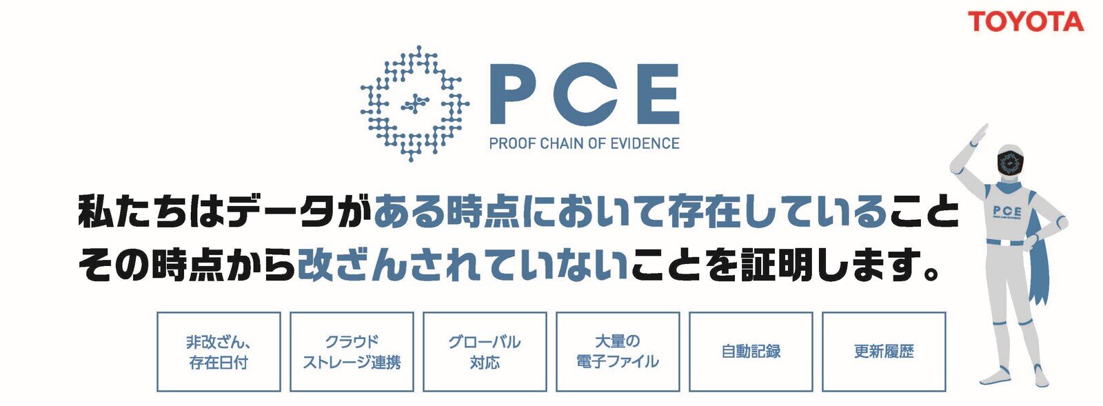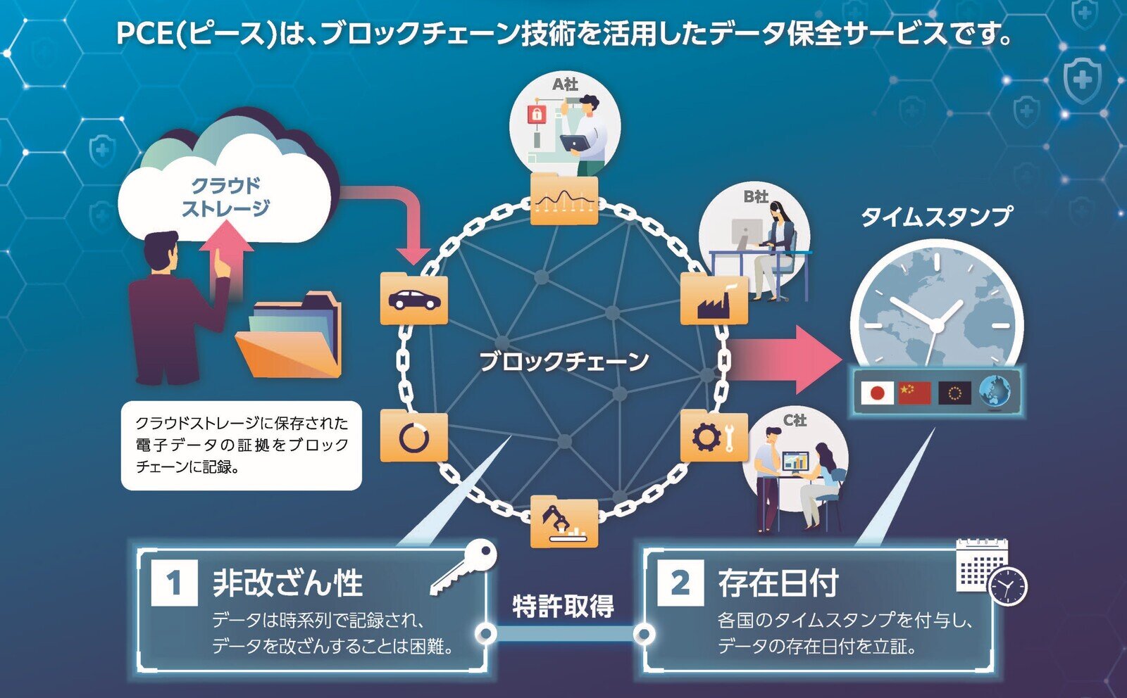 また、電子化が進んだことで改ざんが容易に疑われる時代にもなった。そのような危機感が「PCE(Proof Chain of Evidence」という新事業の立ち上げにつながった。