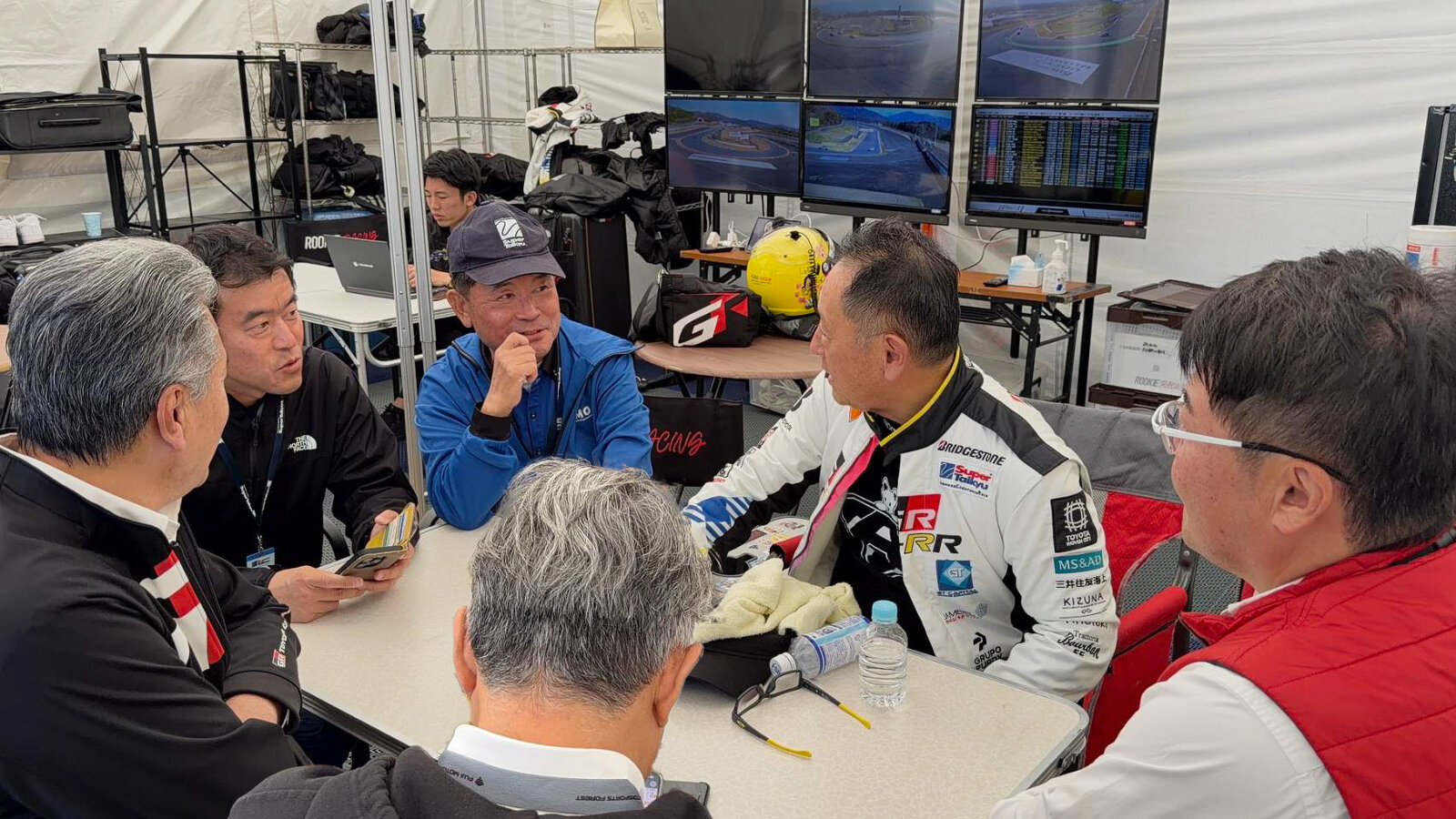豊田氏は即座にSTMO(スーパー耐久未来機構)の“番頭”である加藤俊行氏(写真左奥)、富士スピードウェイ社長の酒井良氏(同手前)、そして「モリゾウカレーの試食に来た」という副社長の中嶋裕樹氏(同左)を招集し、緊急会議をスタート。