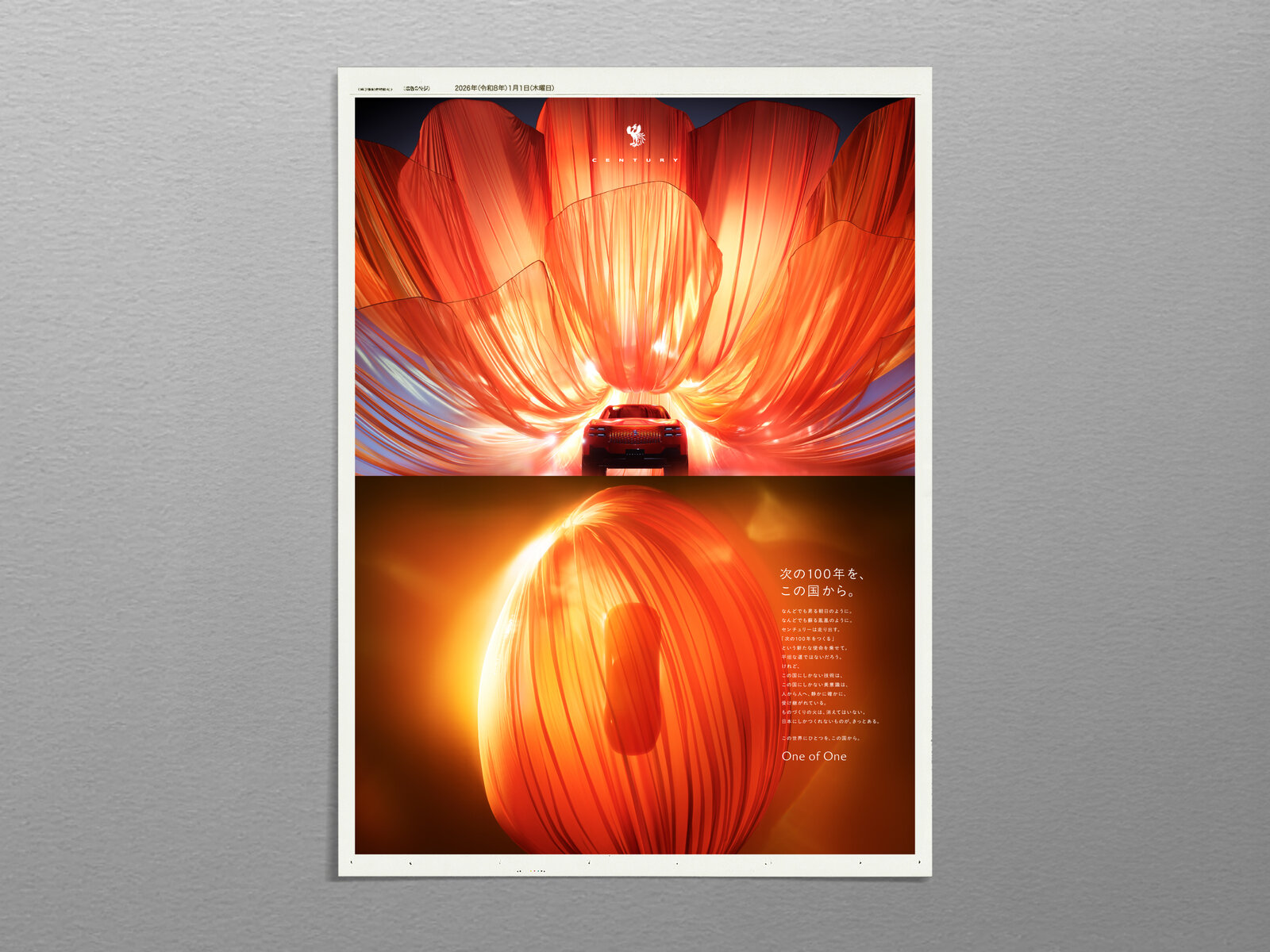 紙面全体を覆い尽くさんばかりの緋色。その中心に鳳凰のエンブレムを抱くセンチュリー。2026年元旦の新聞広告は、日本のモノづくりの誇りを世界に示す言葉が並んだ。