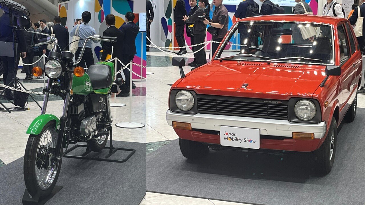 鈴木俊宏 副会長(スズキ)は大学卒業後、「初めて乗った」初代アルト(写真右)とマメタン(同左)を紹介。