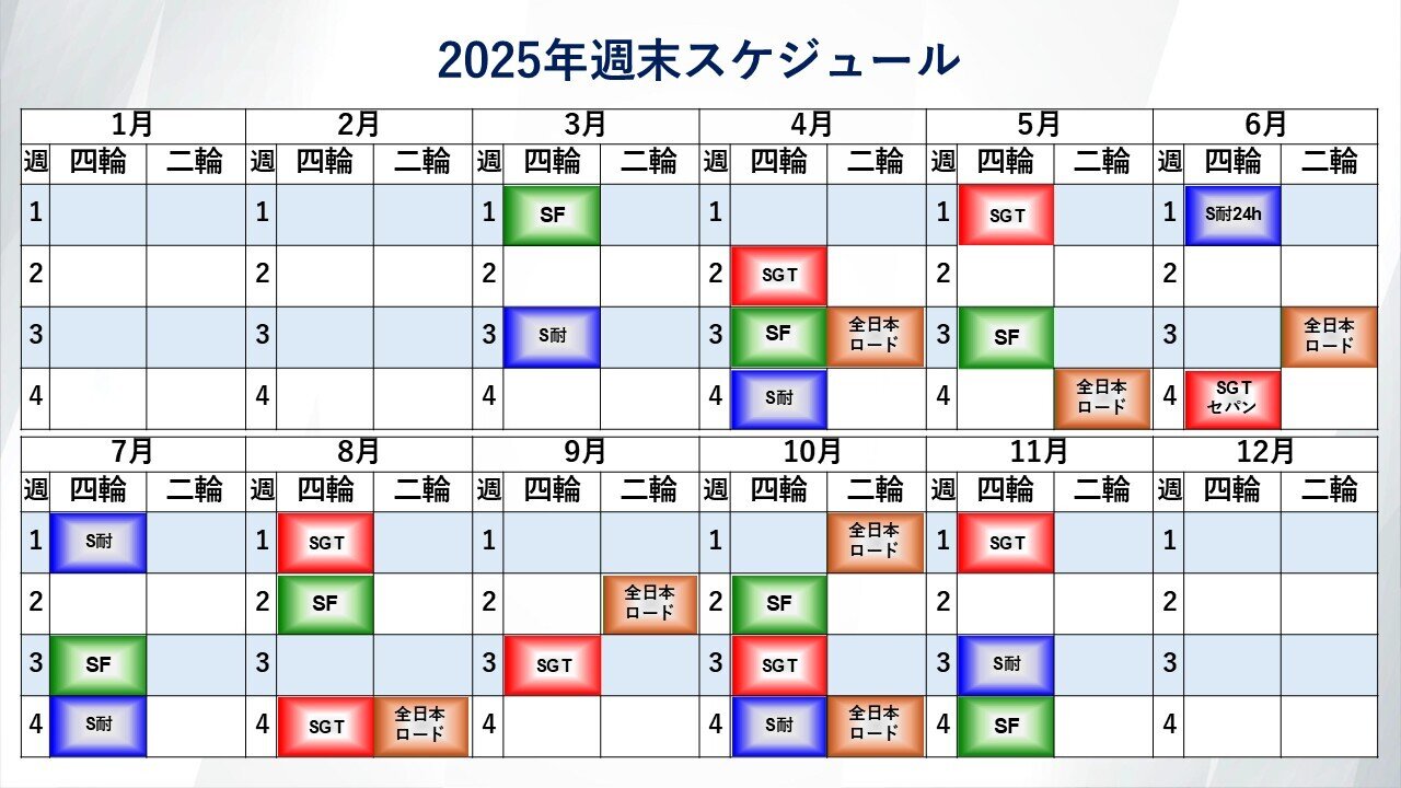 2025年の各週末におけるレースの開催予定をまとめたものだが、3月から11月にかけては、ほぼ毎週のようにレースが行われている。