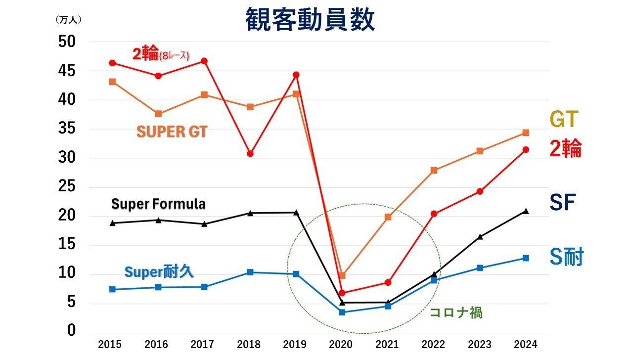 参考として、プロ野球の年間観客動員数は約2,000万人だが、モータースポーツはピーク時で、1カテゴリー最大50万人近くに留まっている。コロナ禍に下落したのちは、再び上昇傾向にあるものの、以前のようなレベルまで回復できていない。