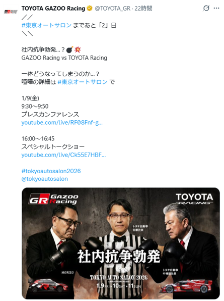 TOYOTA GAZOO Racing(TGR)も、ワクワクするような展示をしてくれるだろう…。と思っていたら、2日前に公式SNSで穏やかではない投稿が。