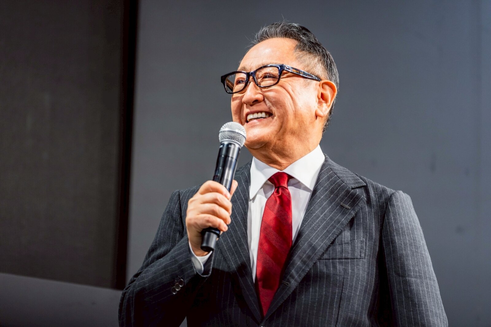 進行役の富川悠太と並んでプレスカンファレンスのステージに上がった、モリゾウこと豊田章男会長。2025年は体調が優れず無念の欠席となったが、26年は元気に新年のあいさつを届けた。