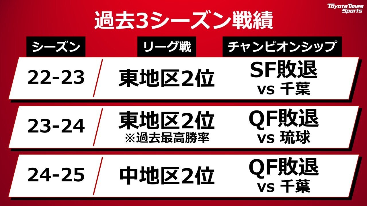 過去3シーズンを振り返ると、リーグ戦では地区2位に入ってチャンピオンシップに進むものの、強豪の千葉や琉球に跳ね返された。三好キャスターは「爆発力がちょっと足りなかったのかなと思います。今までとはちょっと違うことをやるというところを、なかなか出せなくて」と短期決戦の難しさを語った。