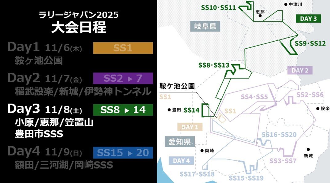 「SS9/SS12恵那」「SS10/SS11笠置山」で岐阜県内を進み、「SS14豊田市SSS」で愛知県に戻るという4つのコースを走るルート。詳細は山田啓介選手によるSS耳より情報 を確認しよう。