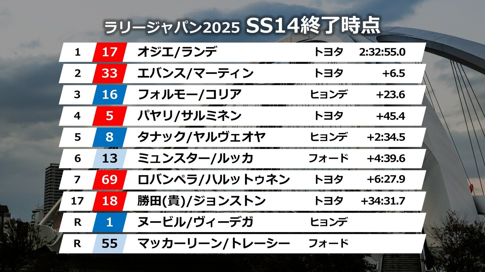 午前の3ステージを終え、トップはオジエ選手、2位エバンス選手、3位勝田選手。3人が僅か5.2秒の中で争う熾烈な展開を見せる。