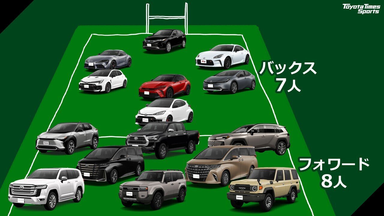 ラグビーのルールはこれまでの放送(関連リンク参照)でも学んできたが、今回はポジションをトヨタのクルマで表現した。ヴェルブリッツのユニフォームにはポジションごとに車種名が記されており、フォワードはランドクルーザーやアルファードなど、ウィングやフルバックを主戦場とする大籔選手は86やスープラ、ハリアーが該当する。