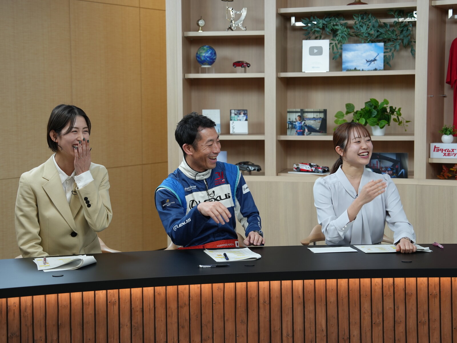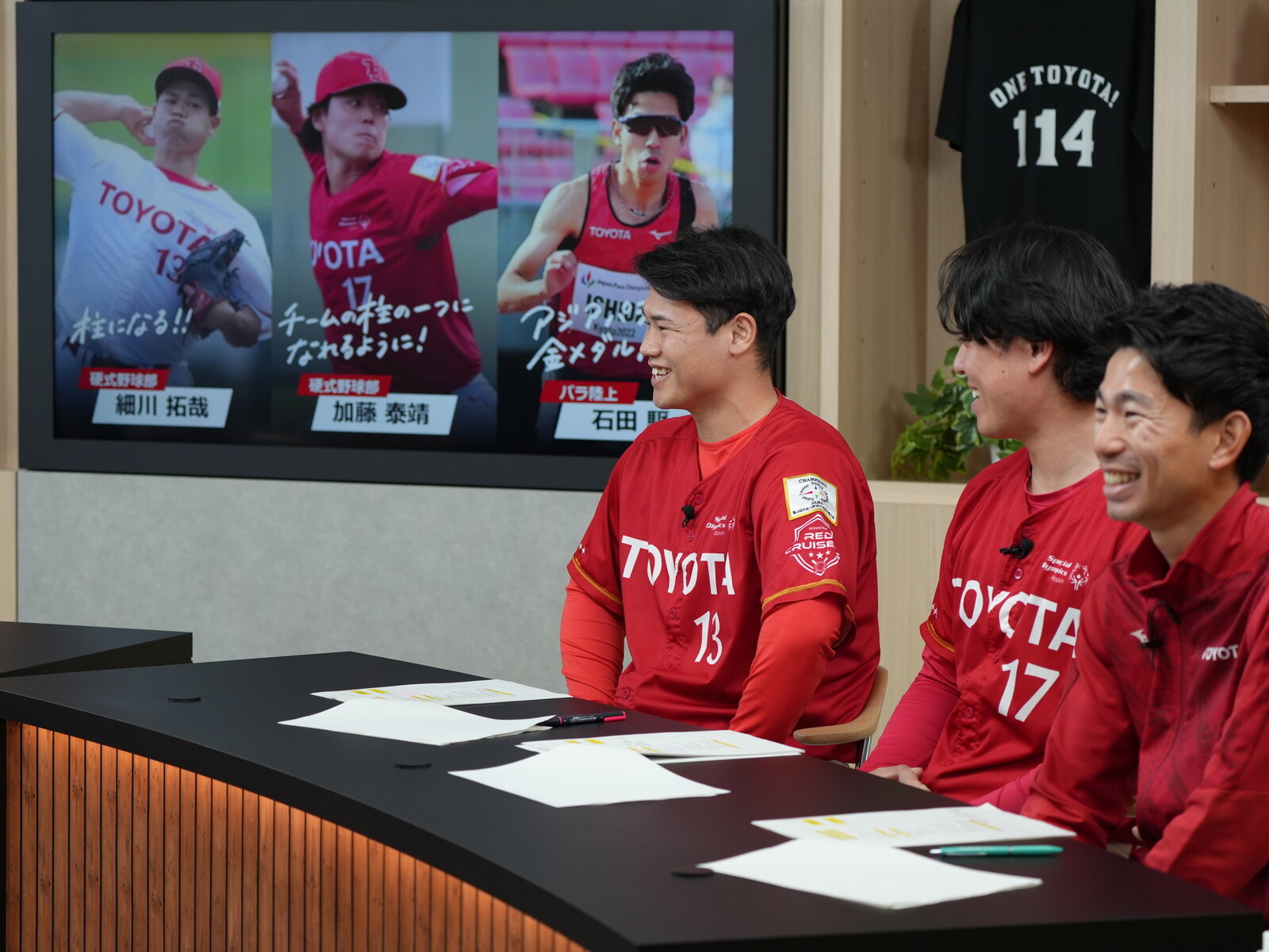 生徒役を務めたのは、硬式野球部レッドクルーザーズで投手陣の“柱”を目指す、3年目コンビの細川拓哉投手と加藤泰靖投手。そして、愛知・名古屋2026アジアパラ競技大会での金メダルを目標にしている、パラ陸上短距離の石田駆選手。温泉が大好きという共通点のある20代半ばの3人だ。
