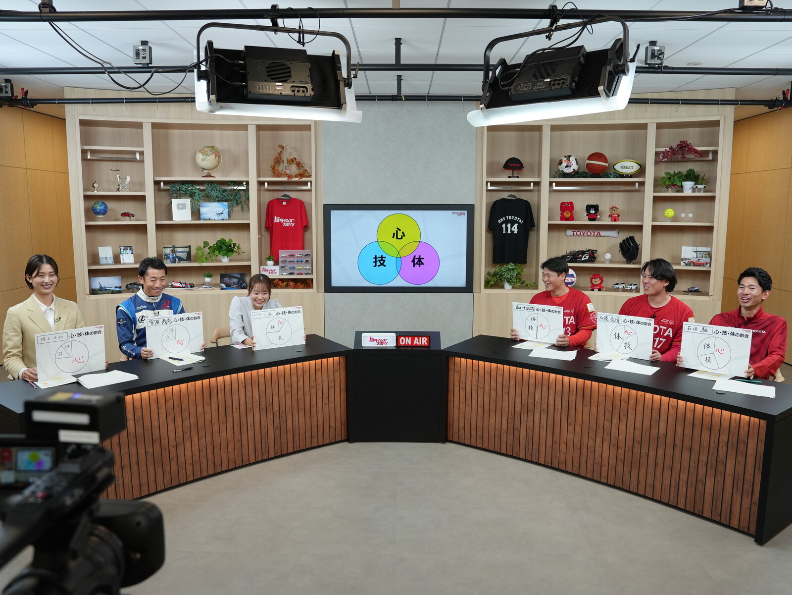 そこで、まず「心・技・体」をどれだけ重要視しているかの割合を、フリップに書いてもらった。3選手の「心」の割合は20から50%だったが、講師の室屋選手と橋本さんは「心」が75%と、大きな違いが見られた。