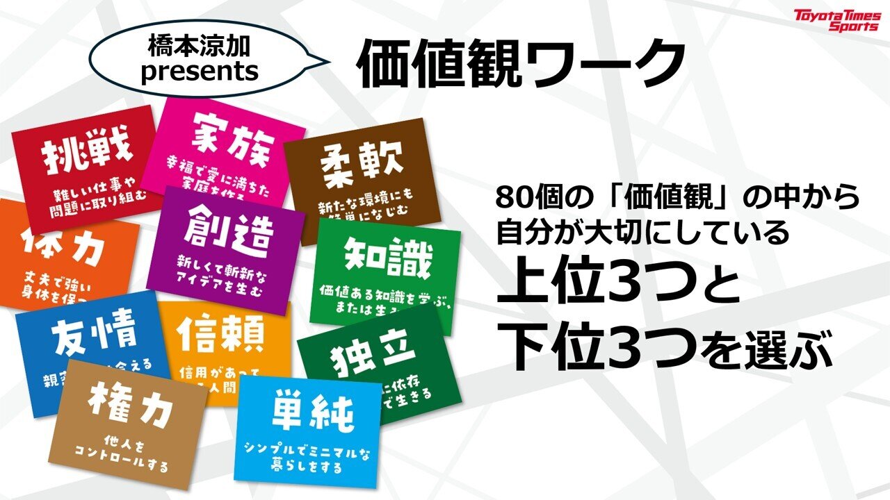 ここからは、実践できるメンタルトレーニングの講義。橋本さんが教える「価値観ワーク」は、自分が競技の中で大切にしている価値観から、上位の3つと下位の3つを選ぶものだ。