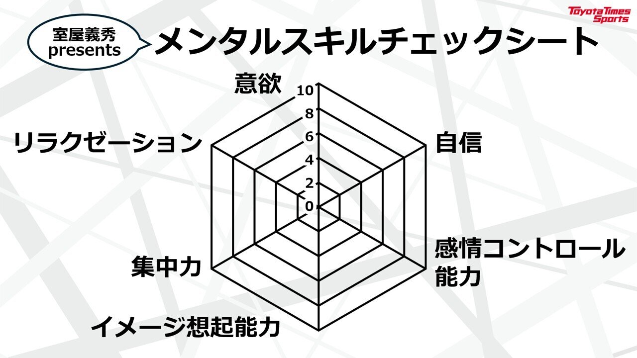 室屋選手が紹介したのは「メンタルスキルチェックシート」。自分のメンタルの強さについて、「意欲」「自信」「感情コントロール能力」「イメージ想起能力」「集中力」「リラクゼーション」の6項目を10段階で評価したチャートだ。